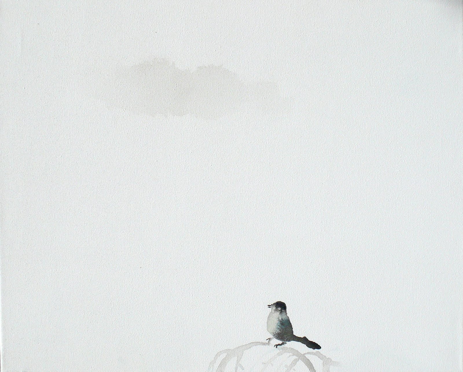 mały ptaszek. mała chmurka. technika własna na płótnie 33x41 cm